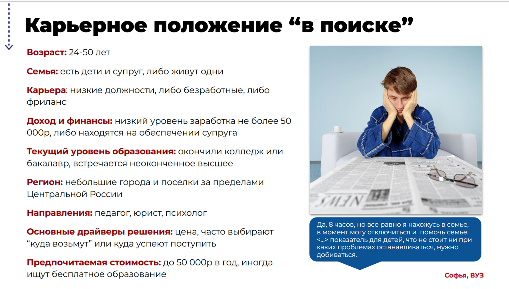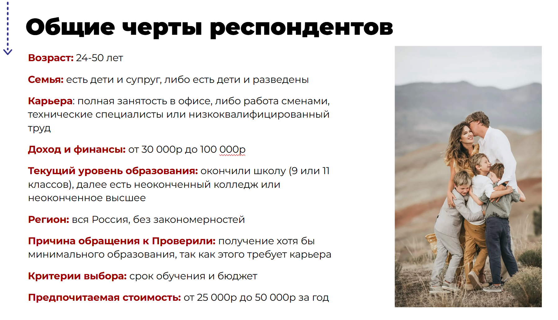 Качественное изучение аудитории, чтобы понять, что на самом деле нужно клиентам. Поможет понять, как мыслит и принимает решение потребитель. Узнаем о скрытых болях и задачах покупателя.