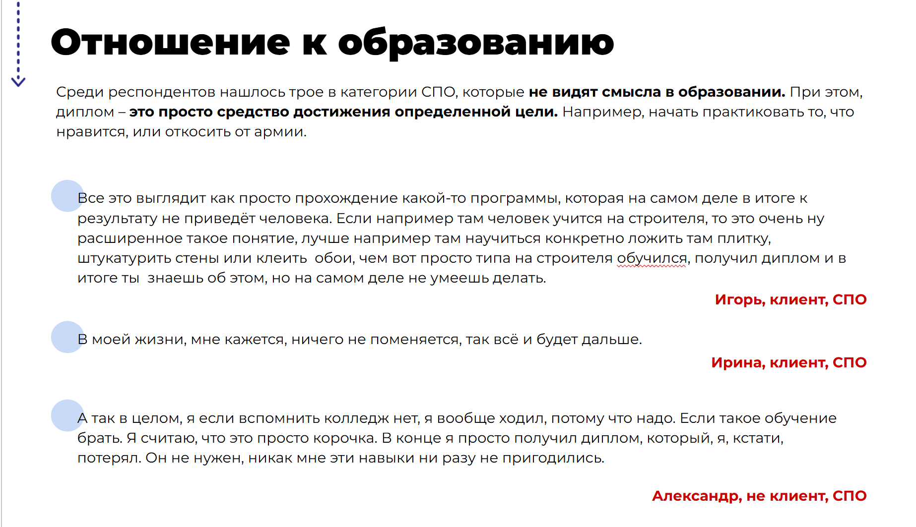 Это метод качественного изучения аудитории. Интервью позволят глубоко погрузиться в опыт и задачи конкретного человека. Лучший способ узнать причинно-следственные связи в голове потребителя.
