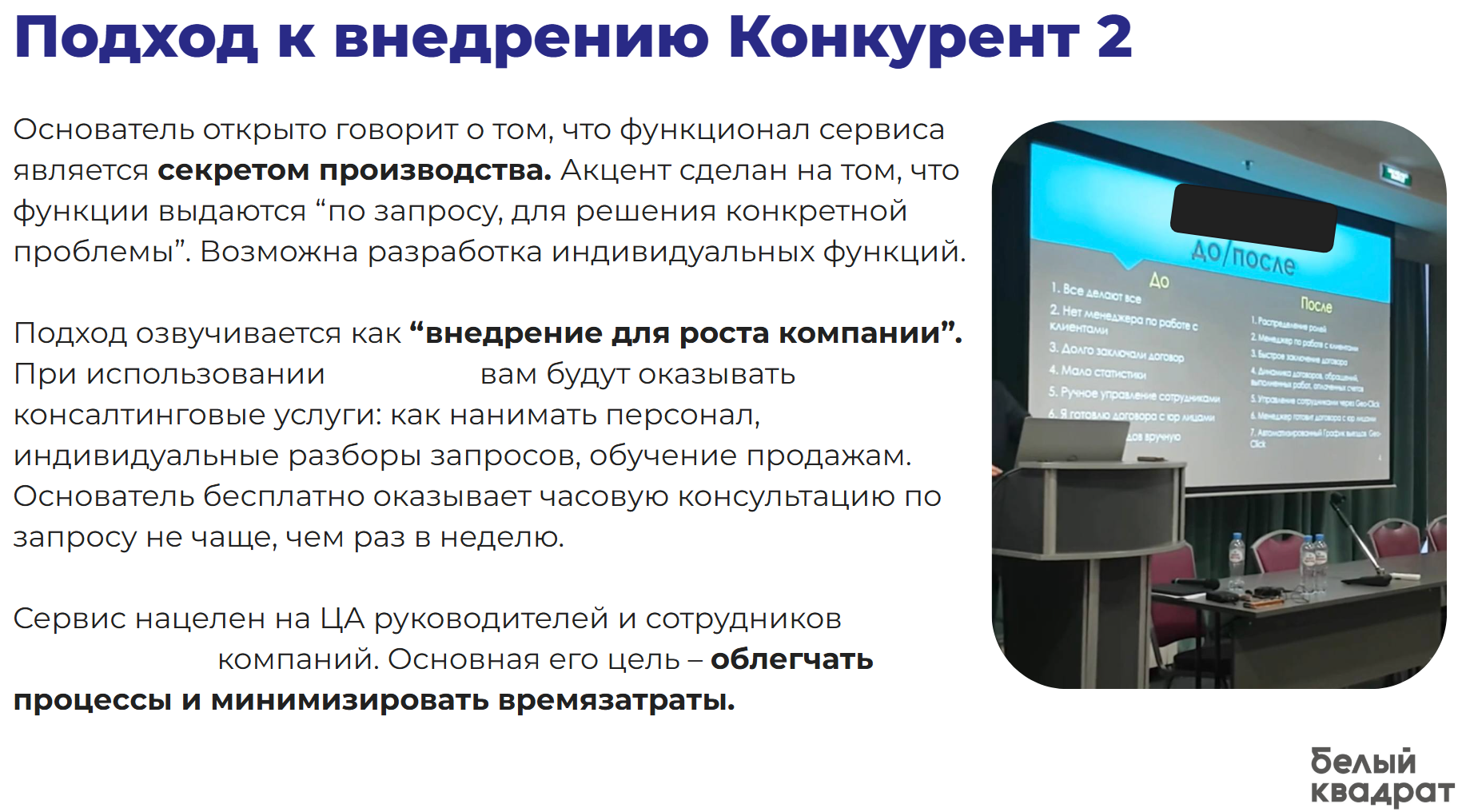 Прозвоним ваших конкурентов и узнаем все об их продажах (даже в сложном В2В-секторе). Расскажем, как у конкурентов выстроена воронка, за счет чего и по каким условиям они продают.